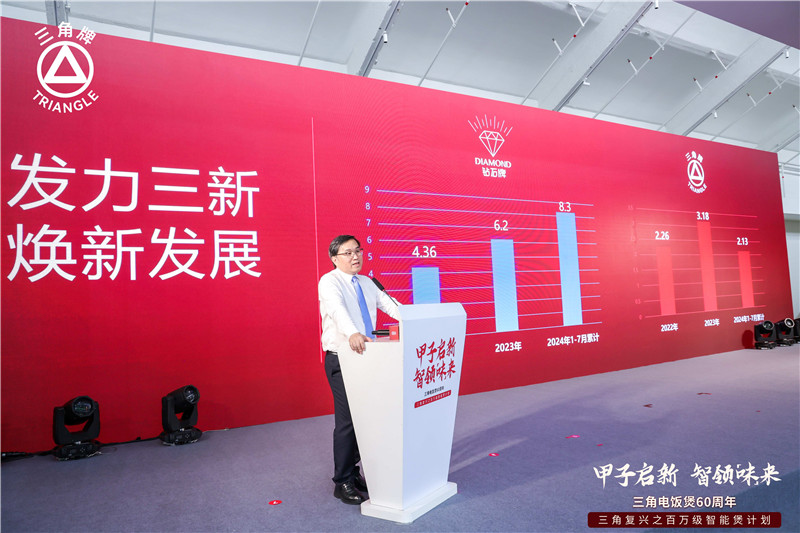 三角公司董事长符荣武围绕“新品突破”为主题致辞。近年来,三角公司坚持落实“发力三新,焕新发展”的工作思路,以“模式创新、品牌焕新、渠道革新”三新发力为突破口,闯出独具特色的老字号“焕新”之路。2024年,三角牌在传统电商平台厨电品类整体下滑的大环境下逆势增长,面对三角牌即将走向复兴的新局势,他提出,“三角牌的复兴蓝图离不开‘铁三角模式’的加持,更依靠以‘新品突破’的核心战略重塑消费者的心智定位。三角牌将聚焦最大基数市场和最能形成影响力的品类--智能煲,卷产品升级,保持决心和勇气全力突破智能煲这一核心赛道。”